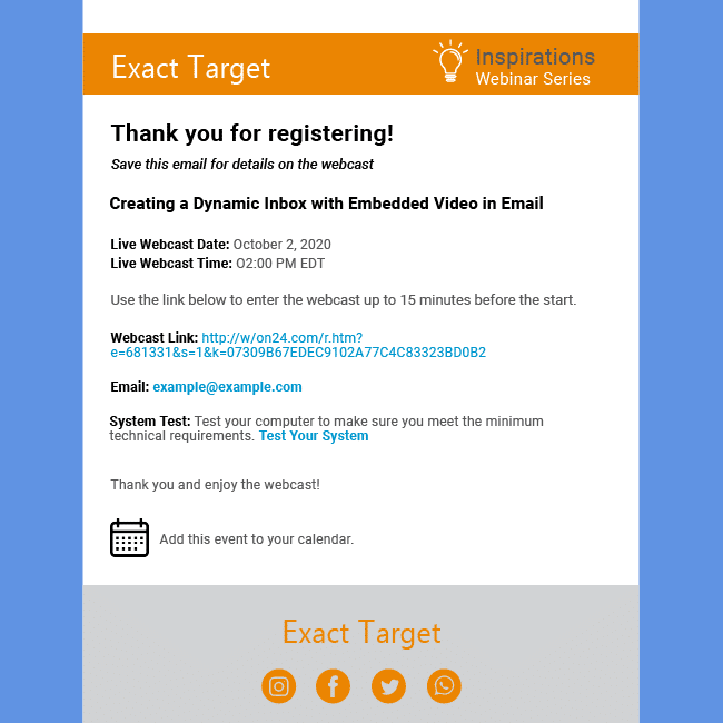 Event Registration: An event registration confirmation email typically includes the name of the event, the date and time, and the location. It may also include instructions on how to prepare for the event and what to bring, as well as any important deadlines or details to remember.