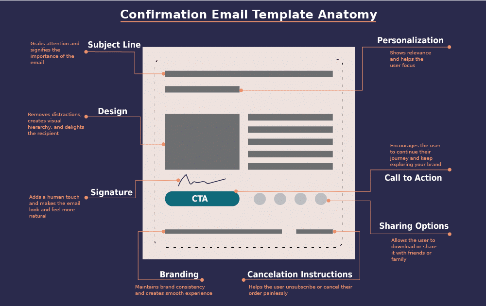 Confirmation email design typically includes several key elements that are essential for communicating important information to the customer and creating a positive customer experience. Some of the key elements that are commonly included in confirmation emails are:
