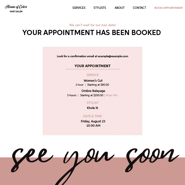 Hair Salon: A hair salon appointment confirmation email typically includes the customer’s name, the date and time of the appointment, the name of the stylist, and the location of the salon. They may also include a reminder of any special requests or notes the customer made when booking the appointment and instructions on how to reschedule or cancel the appointment.
